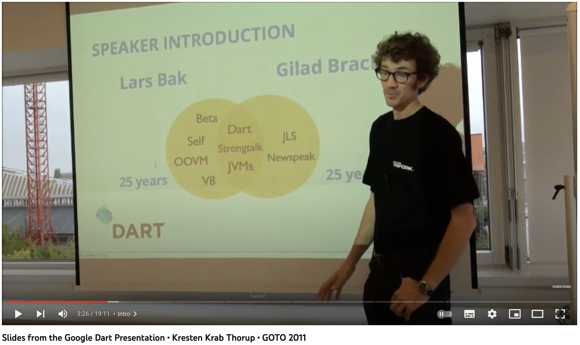 구글이 개발한 다트 프로그래밍 언어(Dart programming language)는 2011년 10월 GOTO 컨퍼런스에서 공개되었습니다. 구글은 크롬에 Dart 가상 머신(virtual machine)을 심어 자바스크립트를 대체하려는 시도를 했지만 웹 개발에 혼란을 가져온다는 여론을 극복하지 못하고 결국 다트 언어를 자바스크립트로 완전 컴파일 가능하게 만드는 데 그쳤습니다. 비록 웹에서 자바스크립트를 대체하겠다는 목적에는 실패했지만 현재 플러터의 인기에 힘입어 모바일 영역에서 다트 언어가 큰 각광을 받고 있습니다.