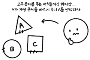코딩 테스트에서 여러분이 보게 될 문제들은 저마다 ‘가장 효율적으로 해결하는 알고리즘’이 있습니다. 이는 알고리즘이 실행되는 제한 시간과 관련이 있습니다. 문제를 풀 수 있는 알고리즘이 여럿 있을 때 어떤 알고리즘은 문제를 빠르게 풀고, 어떤 알고리즘은 문제를 느리게 푼다면 당연히 문제를 빠르게 푸는 알고리즘을 선택해야 할 것입니다. 그런데 그런 알고리즘은 어떤 기준으로 선정해야 할까요? 바로 시간 복잡도를 보고 선정해야 합니다. 시간 복잡도(Time Complexity)란, 알고리즘의 성능을 나타내는 지표로, 입력 크기에 대한 연산 횟수의 상한을 의미합니다. 시간 복잡도는 낮으면 낮을 수록 좋습니다. 이 설명은 이후 내용에서 조금 더 자세히 설명하겠습니다. 예를 들어 어떤 문제를 해결하는 알고리즘 A, B, C가 있을 때 시간 복잡도가 가장 낮은 알고리즘이 A라면 A를 사용하는 게 좋을 겁니다.