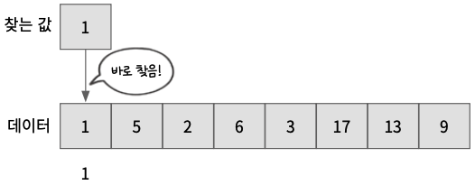값을 가장 빨리 찾는 경우는 검색 시작 위치에 찾을 값이 바로 있는 경우입니다. 다음 그림에서는 배열의 1번째 위치부터 값을 찾고 있는데 찾을 값인 1이 배열 1번째 위치에 있으므로 1번만 비교하여 검색을 끝냅니다.