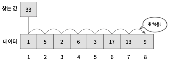 값을 가장 늦게 찾는 경우는 아예 찾으려는 값이 없거나 가장 마지막에 위치하는 경우입니다. 다음은 전체 배열을 탐색해도 찾으려는 값이 없는 경우입니다. 연산 횟수가 최대입니다.