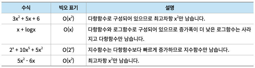 빅오 표기법은 어렵지 않습니다. 어떤 프로그램의 연산 횟수가 f(x)라고 할 때 함수의 최고차항을 남기고 차수를 지워 O(…)와 같이 표기하면 됩니다. 예를 들어 어떤 프로그램의 연산 횟수가 f(x) = 2x2 + 3x + 5라면 시간 복잡도를 O(x2)과 같이 표현하면 됩니다. 빅오 표기법은 다음 표를 보면 더 쉽게 이해할 수 있을 겁니다.
