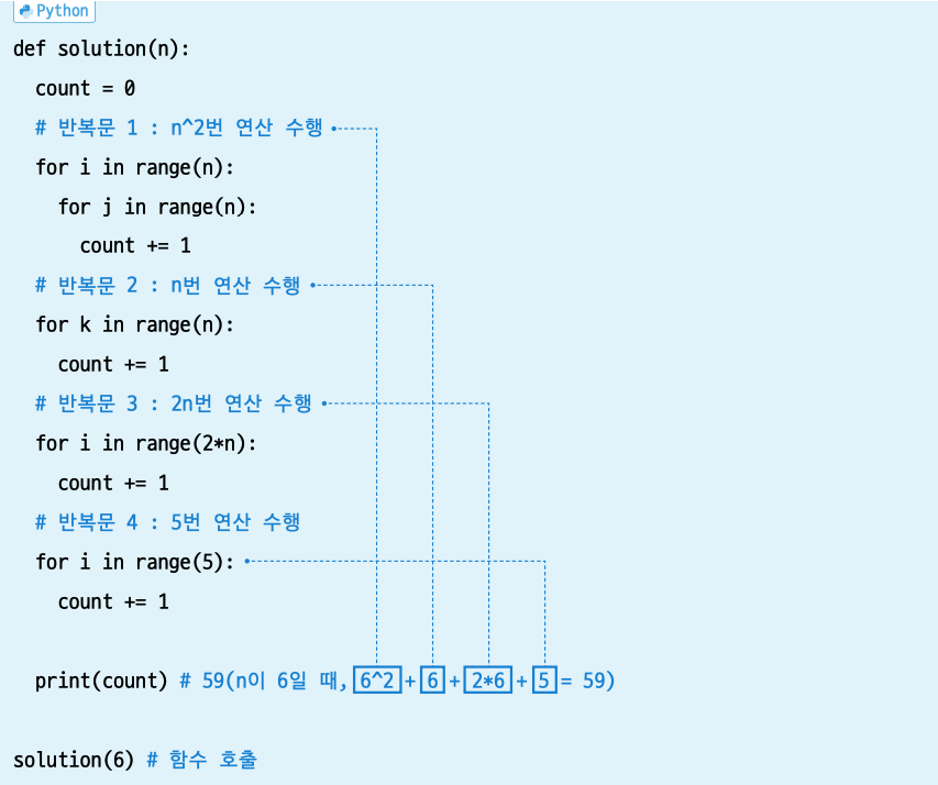 solution( ) 함수는 주석 영역별로 각각 n2, n + 2n, 5번의 증가 연산을 하며 결과값은 곧 연산 횟수를 의미합니다. 지금의 경우 solution(6)을 호출하면 62 + 3*6 + 5, 즉, 연산 횟수는 59입니다.