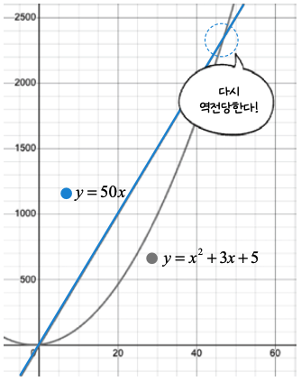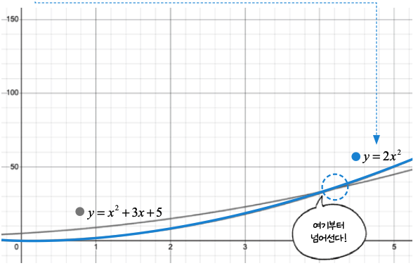 조금만 생각해보면 아니라는 걸 알 수 있습니다. 왜냐하면 50x는 대략 x=47에서 다시 역전당하기 때문이죠. 이런 이유로 ????(x) = x2 + 3x + 5의 시간 복잡도는 O(x2)이라고 쓸 수 있습니다.