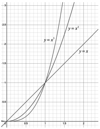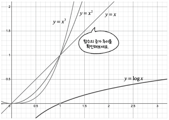 다음은 x, x2, x3를 비교한 그래프입니다. 그래프를 보면 데이터가 커질수록 세 그래프의 차이는 확연히 벌어집니다. x값이 무한하게 커지면 그 격차는 더 심해지겠죠. x3에 비해 x와 x2는 무시할 수 있을 정도로 작을 겁니다.