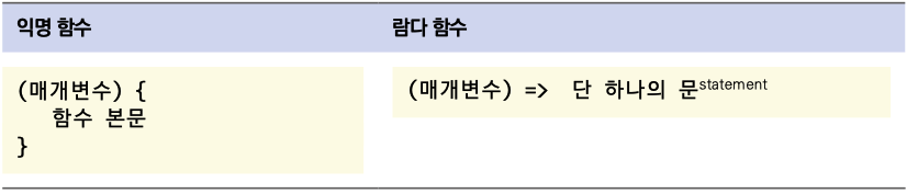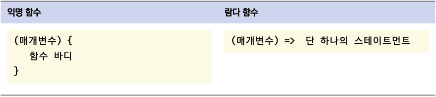 - 익명 함수와 람다 함수 모두 함수 이름이 없으며 일회성으로 쓸 때 사용합니다.