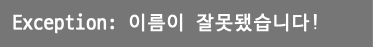 ❶ throw 키워드를 사용해서 에러를 발생시키니 try에 있는 로직 실행이 중지되고 catch 로직이 실행됐습니다. 그래서 name 변숫값은 출력되지 않고 ❷ 발생한 에러 메시지가 출력되었습니다.