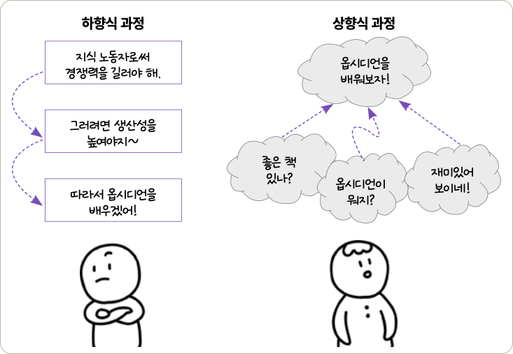 여러분이 옵시디언을 배우기로 결정할 때도 하향식 과정은 아니었을 겁니다. “내가 지식 노동자로써 경쟁력을 기르기 위해선 생산성을 높여야 해. 생산성을 높이기 위한 도구로 옵시디언이 적합해 보여. 최적의 학습 계획은 옵시디언과 제텔카스텐을 잘 설명하는 이 책으로 배우고 생각 정리와 확장에 적용하는 거야. 그러면 나는 지식 노동자로써 더욱 경쟁력이 생기겠지”라는 식의 사고를 하진 않았을 겁니다. 그보다는 우연에 가까운 사소한 이유로 책을 선택했겠죠.