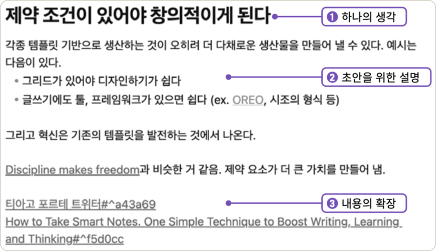 ① 제약 조건이 있어야 창의력이 발휘된다는 아이디어를 적었습니다. ② 나중에 봐도 이해할 수 있도록 디자인과 글쓰기에서의 사례를 추가하고 설명을 덧붙였습니다. ③ 다른 영구 보관용 노트인 ‘Discipline makes freedom(훈육이 자유를 만든다)’ 노트와 연결하여 생각을 확장했습니다. 그 외에도 다양한 노트를 옵시디언의 링크 기능으로 연결했습니다. 이렇게 글감이 모이면 어느 순 간 ‘나를 제약하지만 나를 더 가치 있게 하는 것들’에 대한 글을 쓸 수 있을 것입니다. 제텔카스텐으로 영감을 만드는 과정이 눈에 그려지나요?