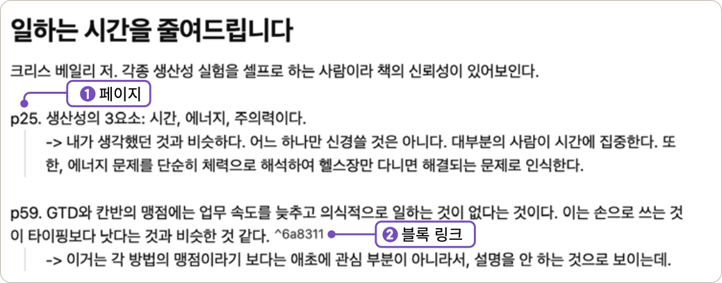 ① p는 페이지를 의미합니다. 모든 내용을 기록하기보다는 건너뛰면서 생각 거리가 될 만한 내용을 적었습니다. 단순 요약뿐만 아니라 제 나름의 생각도 담았습니다. ② 각 내용의 오른쪽 블록 링크는 해당 블록과 영구 보관용 노트를 연결했다는 의미입니다.
